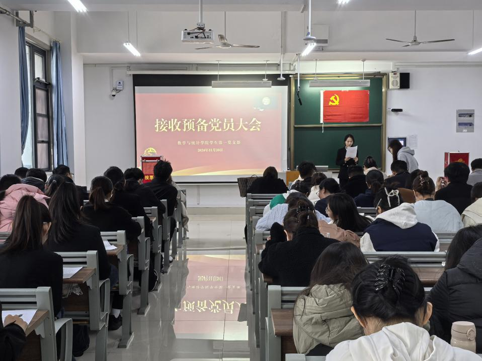 本次接收预备党员大会按规定程序通过了发展对象汇报有关情况、入党介绍人分别介绍发展对象的有关情况、支委会报告发展对象的审查情况、与会党员发表意见,对发展对象能否入党进行充分讨论、无记名投票表决五项议程。经支部大会讨论,大会一致认为,拟接收预备党员入党动机端正,思想作风正派,具有先锋模范带头作用,符合党员标准,经无记名投票表决,学生第一党支部同意接收韦新瑞闫正坤唐硕陈淑媛王可来天宇张子怡7位同志为中共预备党员,学生第二党支部同意接收周霖王超男杜卓颖陆庆华王柯梦袁嘉景6位同志为中共预备党员。新发展预备党员分别进行了表态发言,表示会以优秀党员标准严格要求自己,争做先锋模范,牢记政治生日,发挥学生党员的示范引领作用,争做新时代优秀共产党员。
