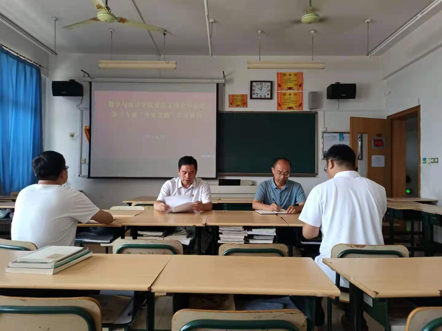 6月22日上午,数学学院党总支理论学习中心组在综合楼1309教室开展党史学习教育“学史崇德”专题学习研讨,党总支书记张成柱主持,理论中心组全体成员参加学习。